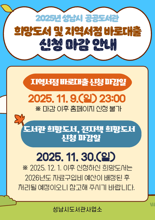 제목 | 2025년 성남시 공공도서관 지역서점 바로대출 및 도서관 희망도서 신청 마감 안내 |